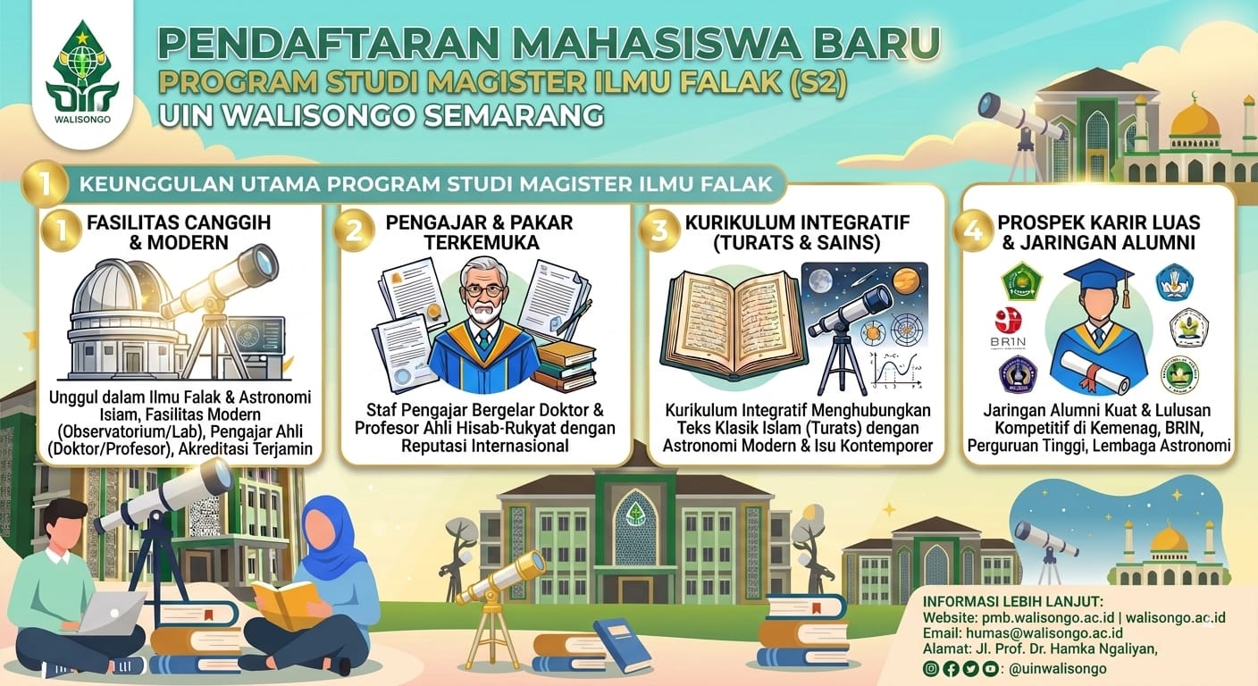 Program Magister Ilmu Falak menghadirkan pendidikan tingkat lanjut yang memadukan kajian astronomi dengan tradisi keilmuan Islam. Program ini dirancang untuk menghasilkan lulusan yang memiliki kompetensi akademik dan profesional dalam bidang ilmu falak, khususnya dalam kajian hisab dan rukyat, penentuan arah kiblat, kalender hijriah, serta fenomena astronomi yang berkaitan dengan praktik keagamaan.